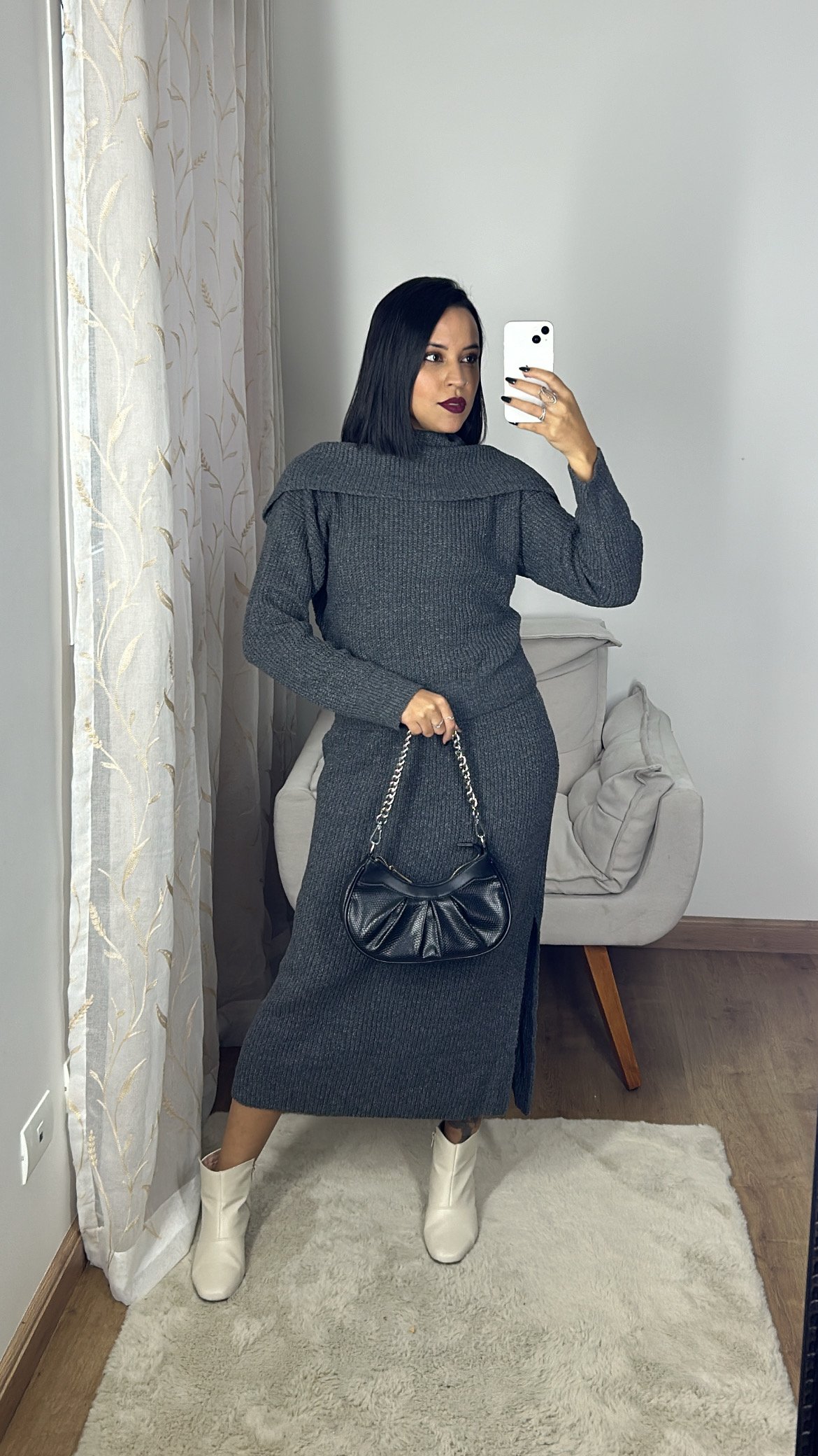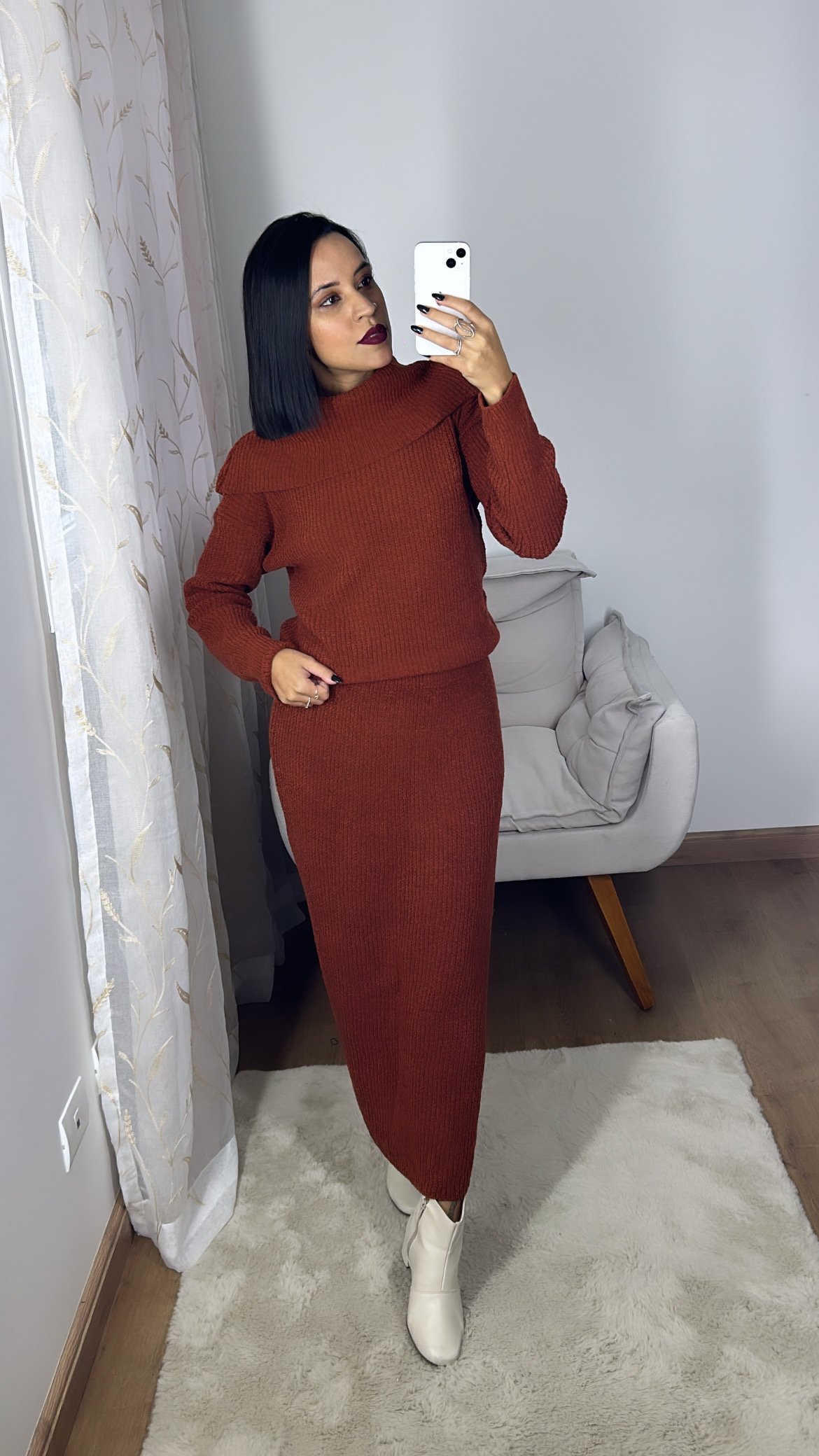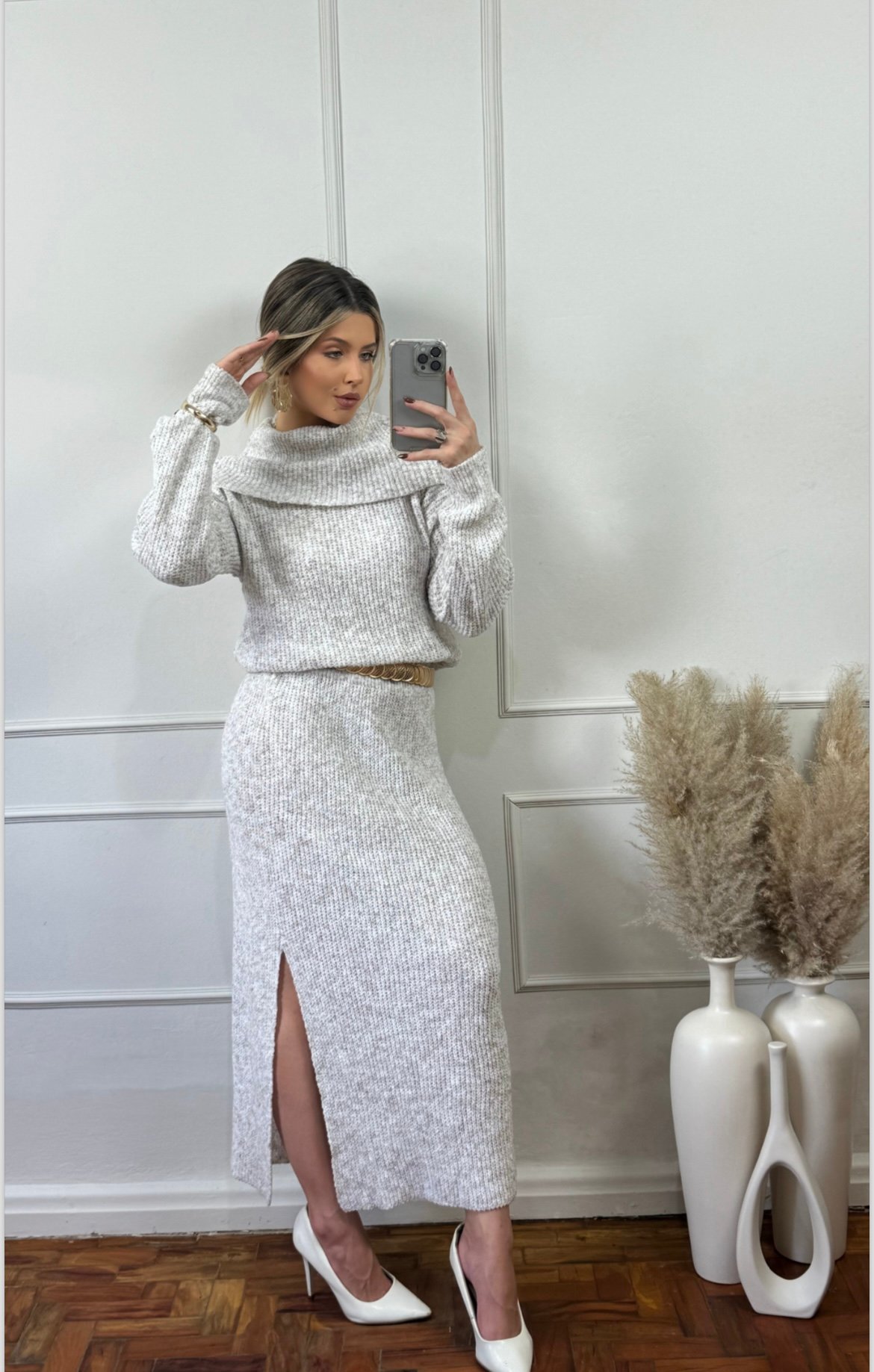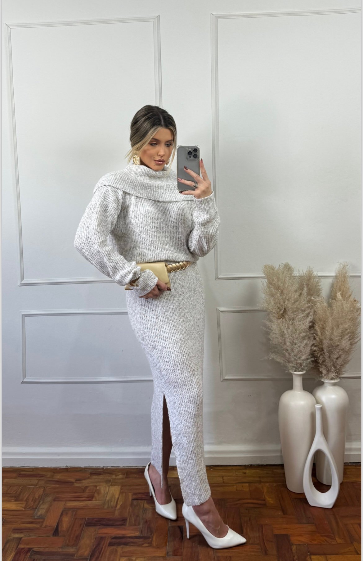• Conjunto Tricot Blusa com gola ombro a ombro e saia midi com fenda lateral;